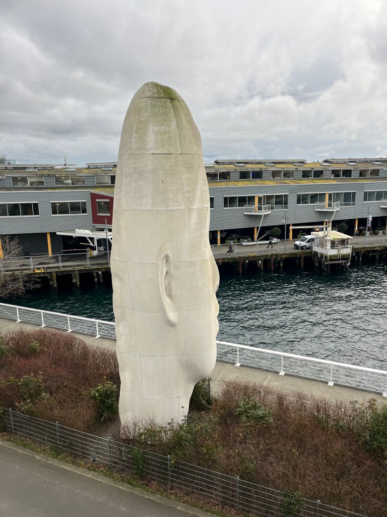 Echo by artist Jaume Plensa at Olympic Sculpture Park, looking out at the Puget Sound