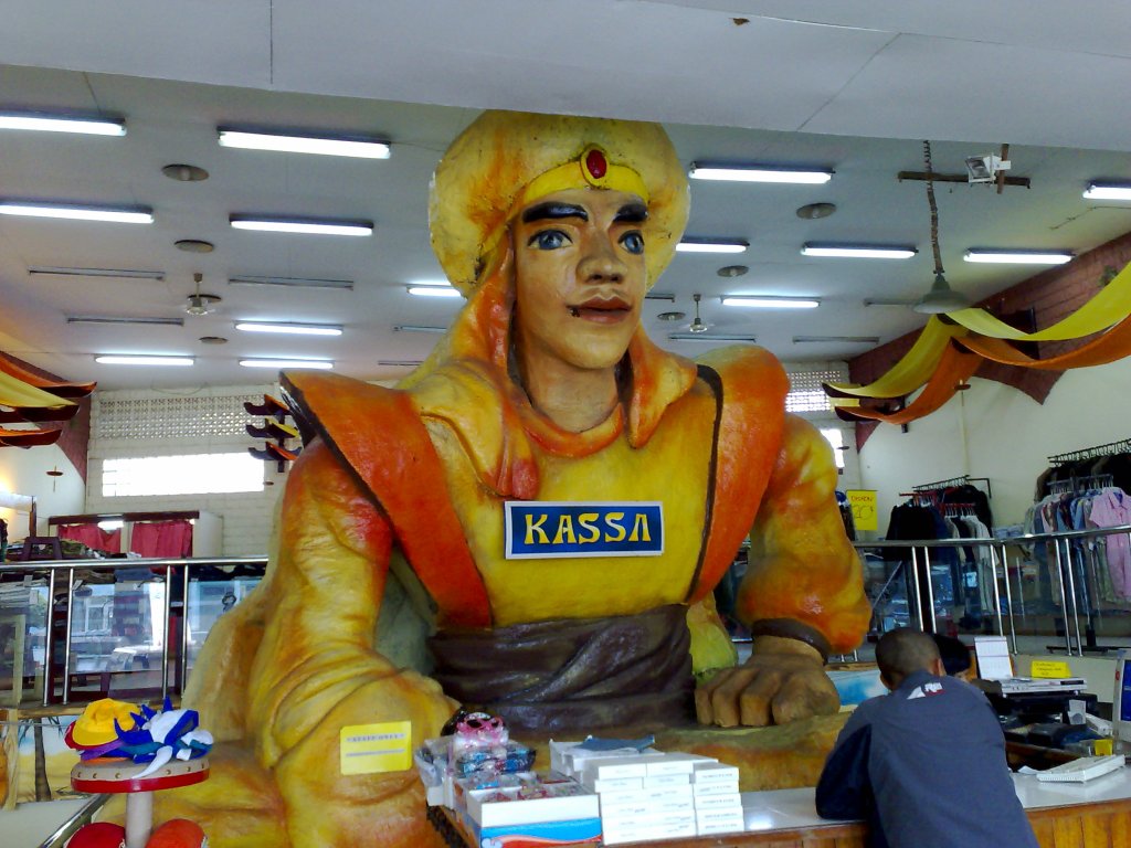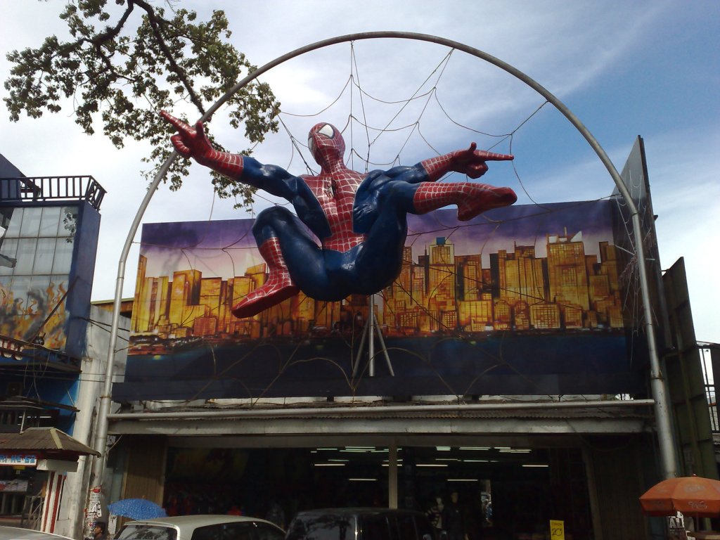 Wolverine statue on Jeans Street Now, the present. You should have lunch at a Sundanese restaurant at the hillside suburb of Dago, where elegant mansions populate lush tree-covered roads. Nearby is Jeans Street, Jalan Cihampelas, where Bandung today defines itself. On the Saturday I was there, it was packed with cars, tour buses and shoppers. In front of its denim shops were massive statues of superheroes: from Superman to Spiderman to Wolverine from X-men. Buskers serenaded the crowd. Kitsch is cool here.