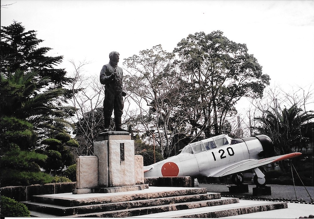 Statues of pilots saluting Mitsubishi Zero The museum’s main hall is dominated by a Mitsubishi Zero and a statue of a brave pilot saluting from the cockpit. His proud, stiff-armed salute is being returned by two other pilots bidding him farewell – from the base and no doubt from his life too. Surrounding the plane are exhibits featuring personal mementos from the actual pilots themselves: letters, watches, binoculars and photos, for example. In all of the snapshots, the would-be suicide bombers are smiling, arm-wresting, saluting, eating, drinking ceremonial cups of sake, and being waved off to duty by cooing girls with flowers in their hands.