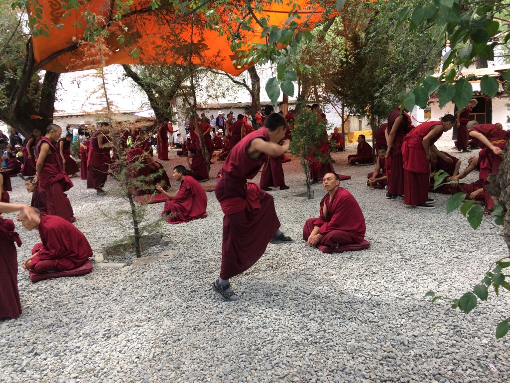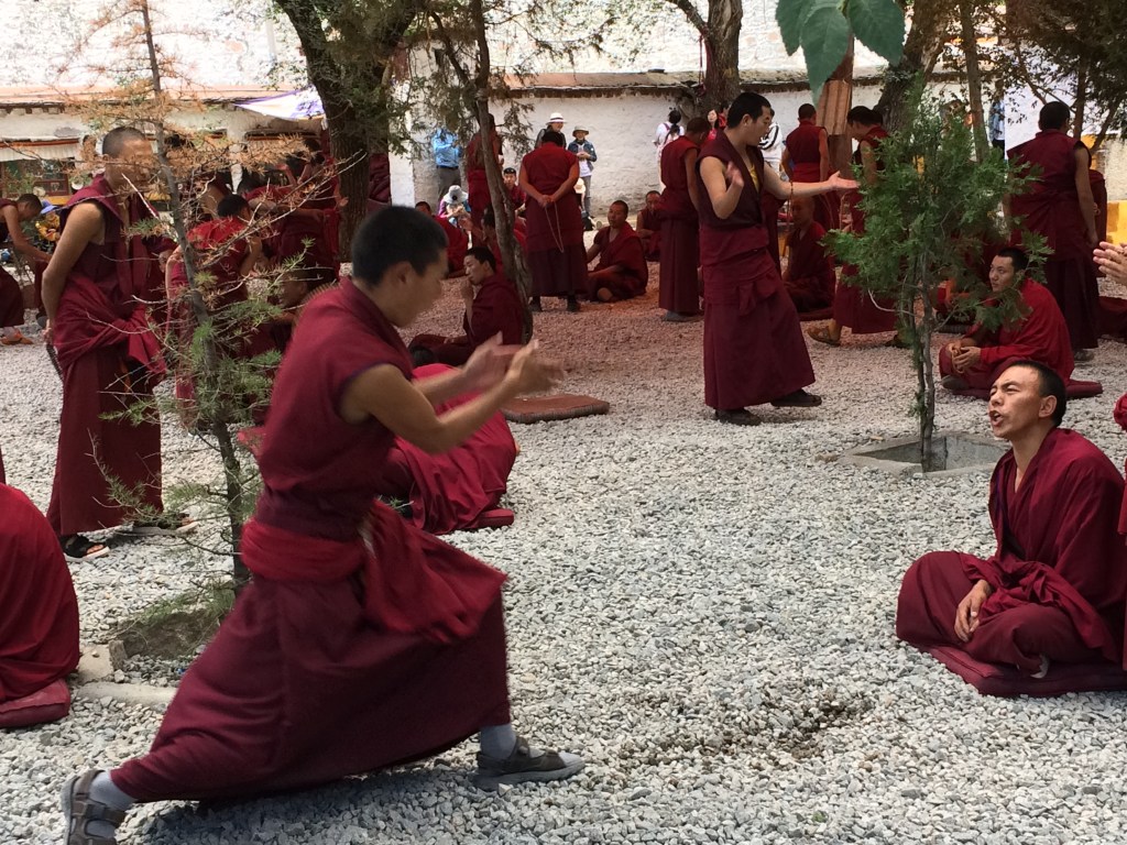 If the Potala Palace and Johkang Temple are the administrative and spiritual hearts of Tibet, Sera Monastery is the intellectual heart. Founded in 1419 the sprawling monastery sits at the foot of the mountains at Lhasa’s edge, a remote nunnery high on a hill above it. Parents take their children here to inoculate them against nightmares. After a monk’s blessing ashes are smeared on their noses and they walk away with smiling faces — safe in the knowledge that sleep will be just blissful dreams. In a sun-dappled courtyard nearby dozens of monks in pairs, one standing and one sitting, debate with vigor. The standing monks, fiddling with prayer beads and stamping their feet and clapping their hands, hurl Buddhist doctrine questions from the Five Major Texts at the sitting monks. The questions are theological ones with rhetorical twists and the gift of constructing eloquent responses prove the intellectual rigor of the monks. Eventually, they switch places. This sparring is mesmerizing to watch, like mental martial arts. The voices rising in challenging tones create a strangely melodious sound like binaural beats from a Haight-Ashbury hippy store. During the 1959 revolt, hundreds of monks were killed here and survivors set up a parallel monastery in exile in Sera, India.