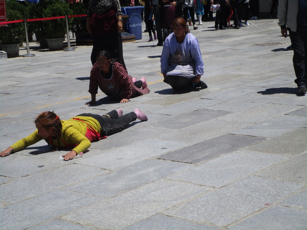 One of the world’s great palaces, perhaps France’s Versailles or Russia’s Winter Palace come close to matching its splendor. I pass through a number of security gauntlets before entering. At the palace’s base, flowers are in full bloom — Tibetan summer and spring converging into a single, very short season of vibrant colors in a landscape that is dour and forbidding most of the year. Potala Palace tickets are timed and visitors move quickly up the stairs in the thin air to meet the various deadlines. Unlike other museum-like grand palaces, it is a place of devotion. Tibetans prostrate themselves in front of shrines and religious relics. Security brusquely moves them along.