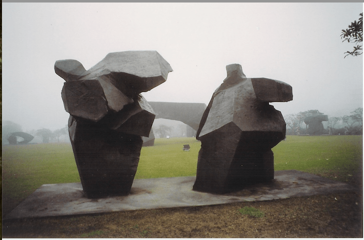 Sculpture with an urban theme I visited on a foggy weekday. Mist rolled over the works, at once obscuring and revealing them. Lack of sunlight dulled the color of the grass and the grey milkwood trees, but gave the works more gravitas as the Tai Chi figures were pushing at each other and the intrusive sky. The ever changing motion from the ground cover clouds helped to convey the stillness and movement of the figures, the uncanny sense that they were observers as well as the observed, like actors in a tableaux. While the figures were abstract or semi-abstract, the strength of their inner spirit was apparent. I was dwarfed by the size of the largest of the pieces, which at 15.2 meters wide by 6.2 meters high was the size of a small house.