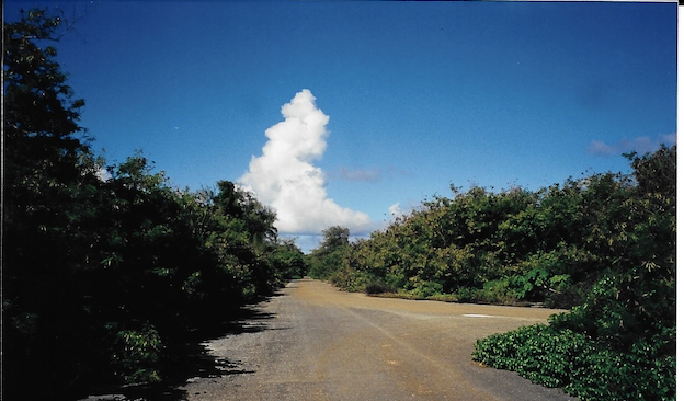 Jungle encroaching on Tinian road From there we drove clear across the island. Because Tinian is shaped like Manhattan the military named the island’s roads after streets in New York. Broadway is a long straight avenue, but unlike its famous namesake there is no traffic at all, no pedestrians, and only a few gutted buildings from World War II days. Weeds sprouted from the asphalt. Jungle is starting to creep in at the edges.