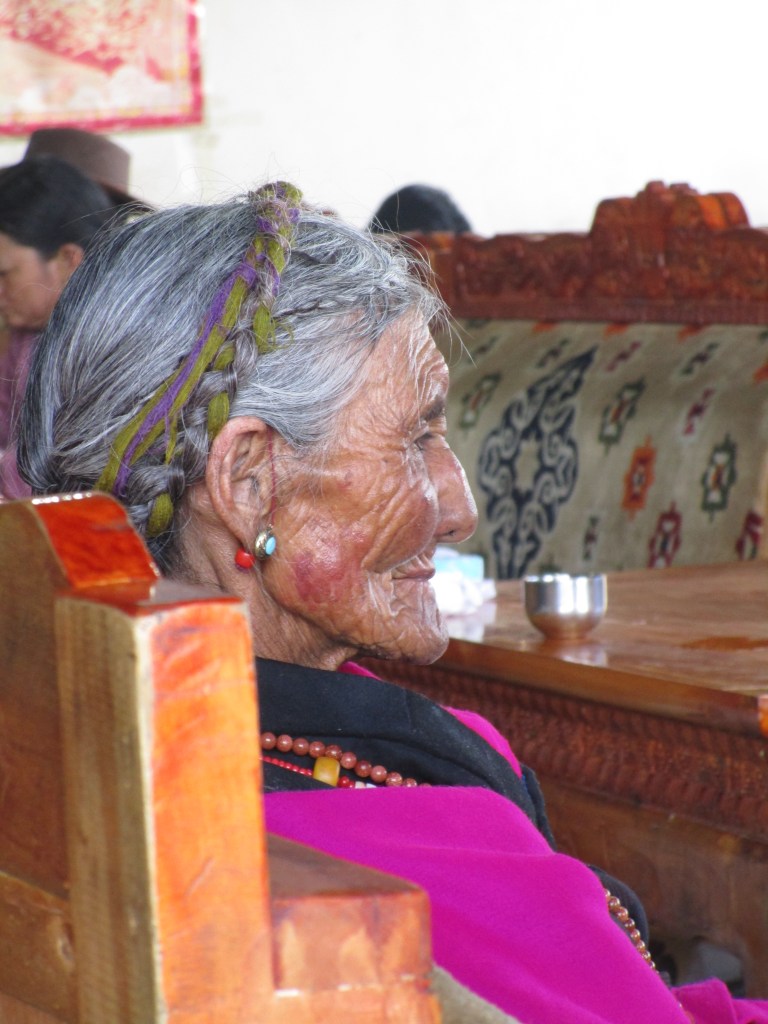 Just outside and within the temple the fervor approaches fever pitch, dozens of people prostrating themselves then lifting themselves up in hope before throwing themselves down again in repetitive demonstrations of piety. The crush inside is driven by the determination that their prayers be heard. Blessings by monks are seemingly cursory as they try to move the crowd through. I don’t understand what people are asking for but I do recognize hope as a universal need. The temple’s magnetism keeps me close to it and the square during my Lhasa visit. That evening I dine on grilled mushrooms and ginger carrot soup at the packed Makye Ame restaurant overlooking the rear of the temple. The yellow-painted building it is in was the 6th Dalai Lama’s palace and named after his mistress. He wrote a poem about her here.