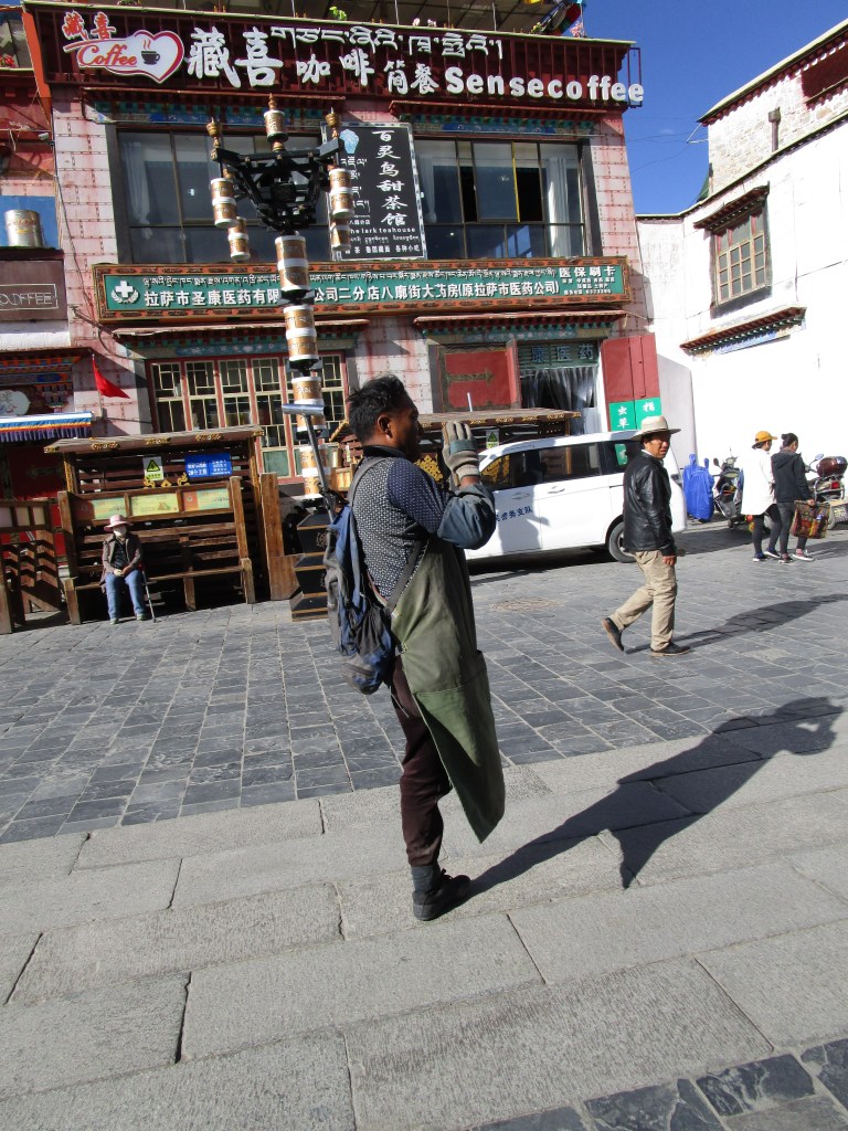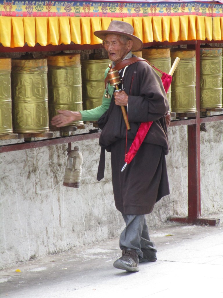 On Barkhor Square I follow the pilgrims’ circumambulation around the Johkang Temple, passing restaurants, tea houses offering Tibetan butter and sweet tea, shops selling prayer flags, beads and other religious items, and antiques of various authenticity. The effect is an ever-moving, ever changing kaleidoscope of people with different poses, emotions, hopes, prayers, despair, physical conditions, and triumphs of sorts moving like a human tide clockwise around the temple and wondering if their life’s lots might change en route – or ever. It’s as turbulent as a Tibetan sky. A scrum of people surrounds a one-legged pilgrim who slams metal bricks together before prostrating himself on the ground. Then he lifts himself up and repeats the process again a few steps further on. It’s easy to hook onto the devotees’ tide and get pulled into their mania. Maybe the thin air helped —oxygen deprivation giving a light-headed perspective on the scene, like lining up a shot through fisheye lens for a distorted view of the world.