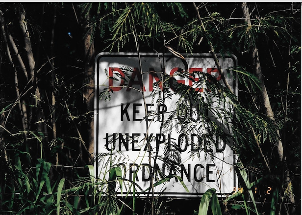 Unexploded World War II ordnance on Tinian At a roundabout there was a ruined Japanese shrine. We drove around it to a truly forbidding part of the island. The road narrowed and every couple of yards there were signs on jungle-covered barbed-wire fences that warned of explosive ordinance. After a couple of miles there was a dirt turnoff to the left where we stopped next to a large grave-size plot with a few flowers on it and a headless palm-tree in front of it. A wooden sign read, “Atomic Bomb Pit No. 1.” The plaque described how the bomb dropped on Hiroshima was winched into the belly of the Enola Gay at this spot.